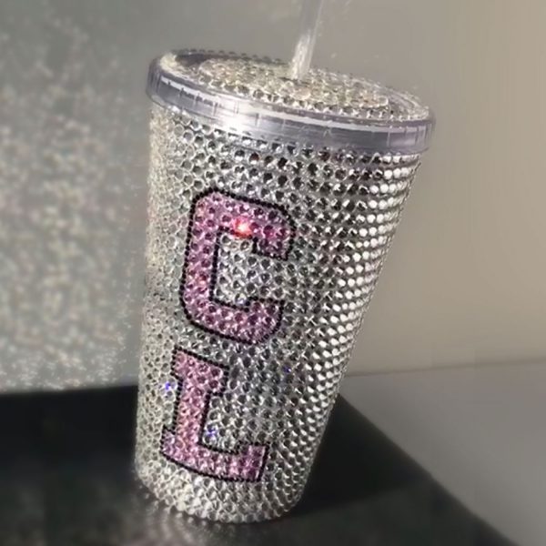 A real show-stopper! A double-walled insulated drinks tumbler fully embellished in 1000s of Swarovski crystals with initials of your choice in Varsity-style script. Any colour tumbler/initials.